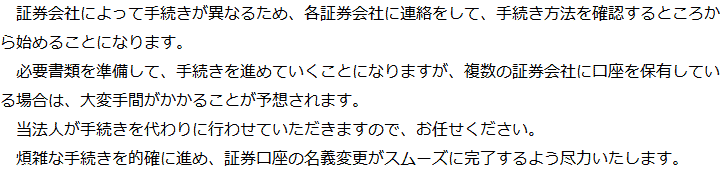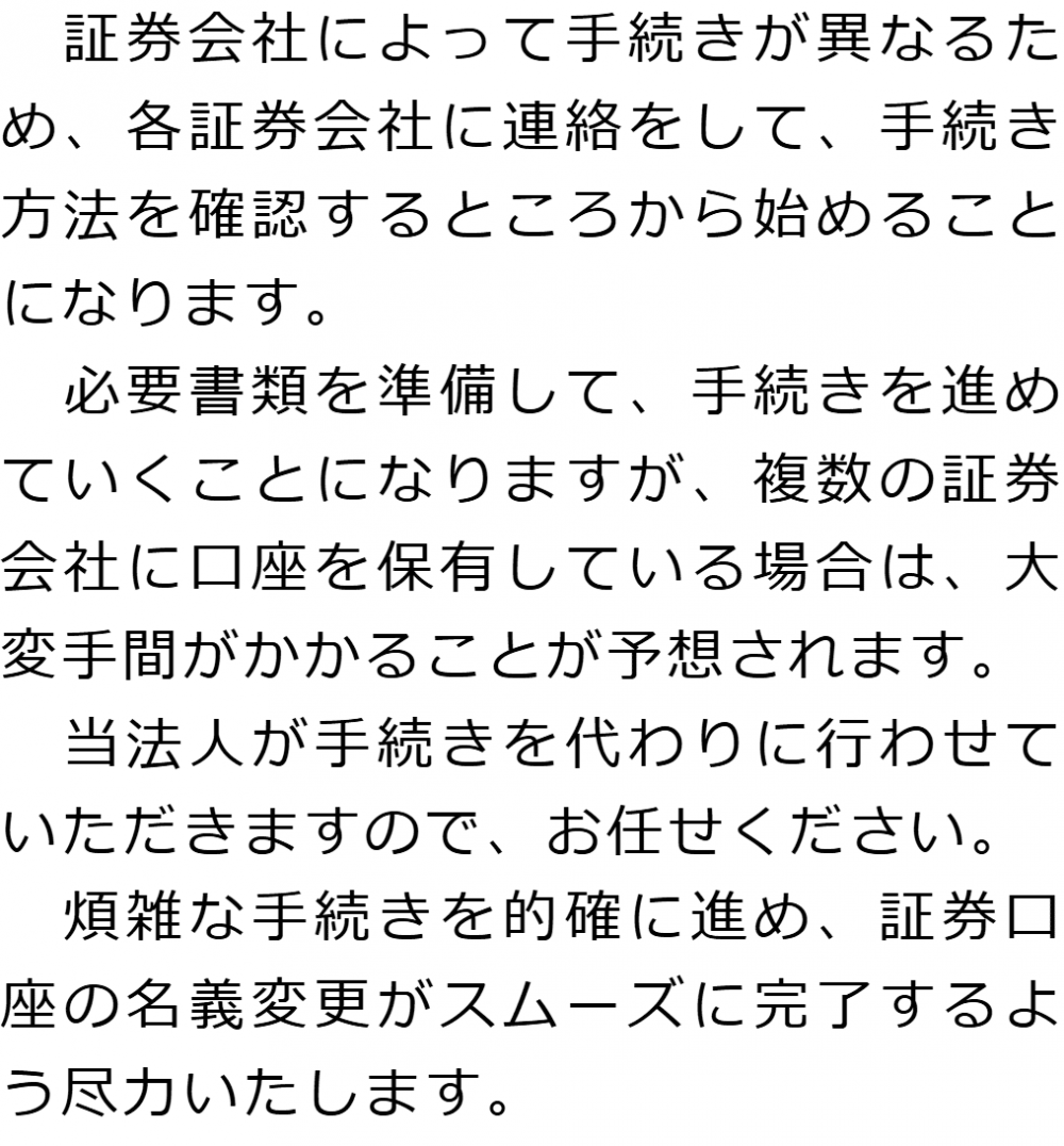 トップ業務内容証券口座の解約・名義変更 階層構造▼ 業務内容(目次) 証券口座の解約・名義変更 業務内容(目次)業務内容トップ行政書士法人心の業務内容遺言遺産整理相続人調査相続財産調査遺産分割協議書の作成預金・貯金の解約・名義変更証券口座の解約・名義変更自動車の名義変更心グループのその他の業務内容家族信託・民事信託節税対策事業承継遺言の検認相続放棄限定承認遺産分割遺留分侵害額請求相続登記相続税申告相続税調査 受付時間 平日 9時~21時、土日祝 9時~18時 夜間・土日祝の相談も対応します (要予約) 所在地 〒601-8003 京都府京都市南区東九条西山王町11白川ビルⅡ4F 0120-2403-39 お問合せ・アクセス・地図