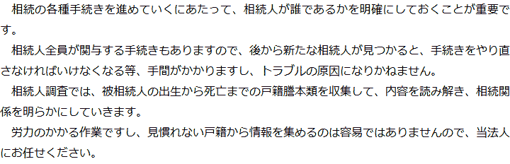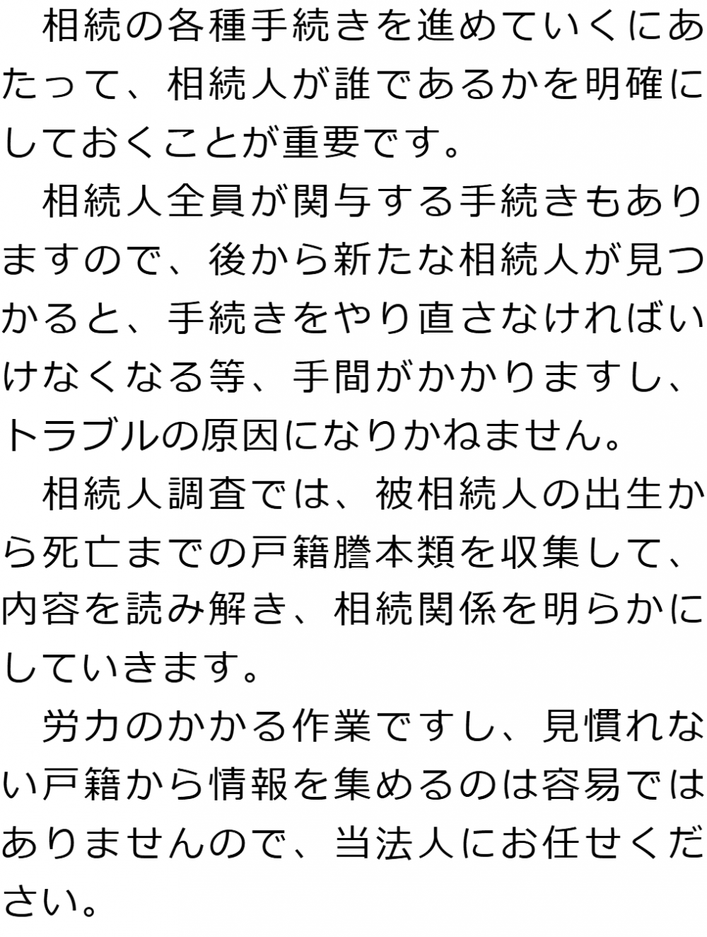 トップ業務内容相続人調査 階層構造▼ 業務内容(目次) 相続人調査 業務内容(目次)業務内容トップ行政書士法人心の業務内容遺言遺産整理相続人調査相続財産調査遺産分割協議書の作成預金・貯金の解約・名義変更証券口座の解約・名義変更自動車の名義変更心グループのその他の業務内容家族信託・民事信託節税対策事業承継遺言の検認相続放棄限定承認遺産分割遺留分侵害額請求相続登記相続税申告相続税調査 受付時間 平日 9時~21時、土日祝 9時~18時 夜間・土日祝の相談も対応します (要予約) 所在地 〒601-8003 京都府京都市南区東九条西山王町11白川ビルⅡ4F 0120-2403-39 お問合せ・アクセス・地図