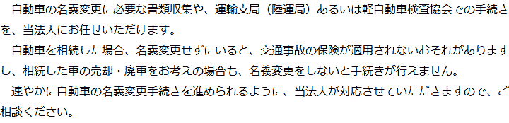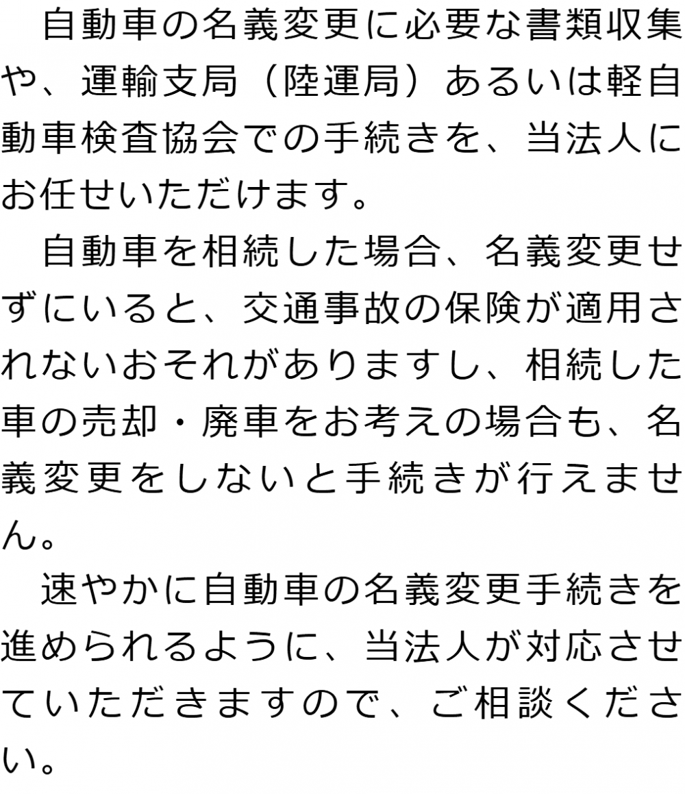 トップ業務内容自動車の名義変更 階層構造▼ 業務内容(目次) 自動車の名義変更 業務内容(目次)業務内容トップ行政書士法人心の業務内容遺言遺産整理相続人調査相続財産調査遺産分割協議書の作成預金・貯金の解約・名義変更証券口座の解約・名義変更自動車の名義変更心グループのその他の業務内容家族信託・民事信託節税対策事業承継遺言の検認相続放棄限定承認遺産分割遺留分侵害額請求相続登記相続税申告相続税調査 受付時間 平日 9時~21時、土日祝 9時~18時 夜間・土日祝の相談も対応します (要予約) 所在地 〒601-8003 京都府京都市南区東九条西山王町11白川ビルⅡ4F 0120-2403-39 お問合せ・アクセス・地図