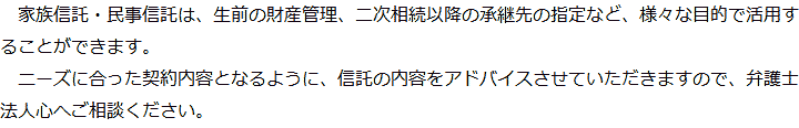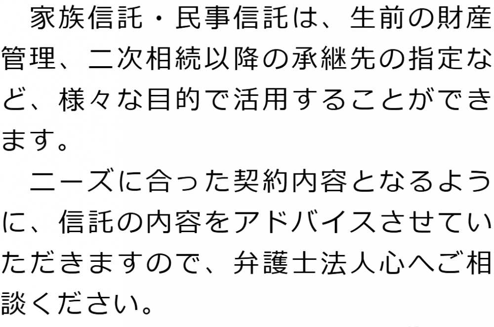 トップ業務内容家族信託・民事信託 階層構造▼ 業務内容(目次) 家族信託・民事信託 業務内容(目次)業務内容トップ行政書士法人心の業務内容遺言遺産整理相続人調査相続財産調査遺産分割協議書の作成預金・貯金の解約・名義変更証券口座の解約・名義変更自動車の名義変更心グループのその他の業務内容家族信託・民事信託節税対策事業承継遺言の検認相続放棄限定承認遺産分割遺留分侵害額請求相続登記相続税申告相続税調査 受付時間 平日 9時~21時、土日祝 9時~18時 夜間・土日祝の相談も対応します (要予約) 所在地 〒601-8003 京都府京都市南区東九条西山王町11白川ビルⅡ4F 0120-2403-39 お問合せ・アクセス・地図
