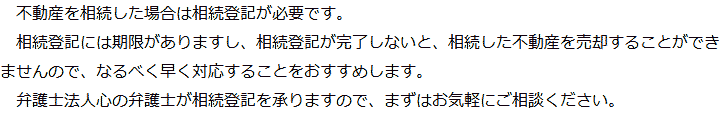 トップ業務内容相続登記 階層構造▼ 業務内容(目次) 相続登記 業務内容(目次)業務内容トップ行政書士法人心の業務内容遺言遺産整理相続人調査相続財産調査遺産分割協議書の作成預金・貯金の解約・名義変更証券口座の解約・名義変更自動車の名義変更心グループのその他の業務内容家族信託・民事信託節税対策事業承継遺言の検認相続放棄限定承認遺産分割遺留分侵害額請求相続登記相続税申告相続税調査 受付時間 平日 9時~21時、土日祝 9時~18時 夜間・土日祝の相談も対応します (要予約) 所在地 〒601-8003 京都府京都市南区東九条西山王町11白川ビルⅡ4F 0120-2403-39 お問合せ・アクセス・地図