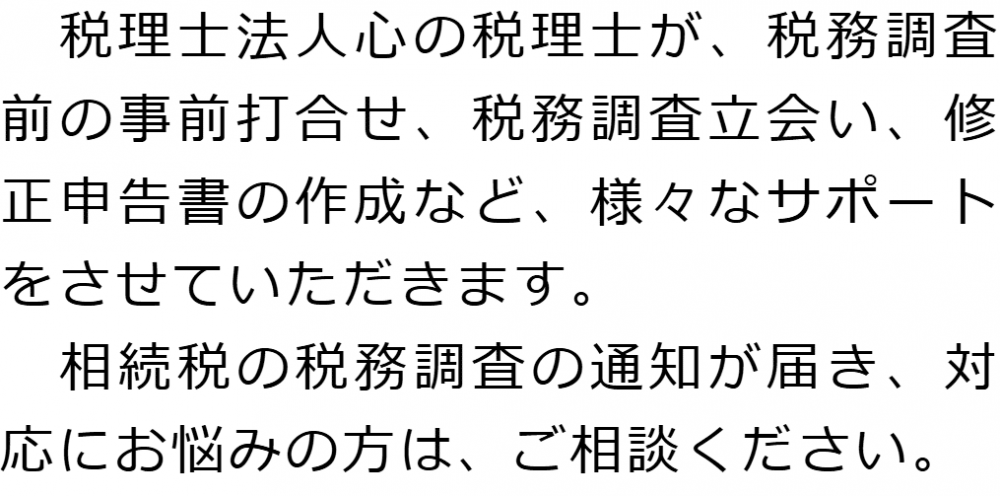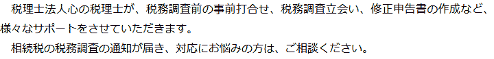 トップ業務内容相続税調査 階層構造▼ 業務内容(目次) 相続税調査 業務内容(目次)業務内容トップ行政書士法人心の業務内容遺言遺産整理相続人調査相続財産調査遺産分割協議書の作成預金・貯金の解約・名義変更証券口座の解約・名義変更自動車の名義変更心グループのその他の業務内容家族信託・民事信託節税対策事業承継遺言の検認相続放棄限定承認遺産分割遺留分侵害額請求相続登記相続税申告相続税調査 受付時間 平日 9時~21時、土日祝 9時~18時 夜間・土日祝の相談も対応します (要予約) 所在地 〒601-8003 京都府京都市南区東九条西山王町11白川ビルⅡ4F 0120-2403-39 お問合せ・アクセス・地図